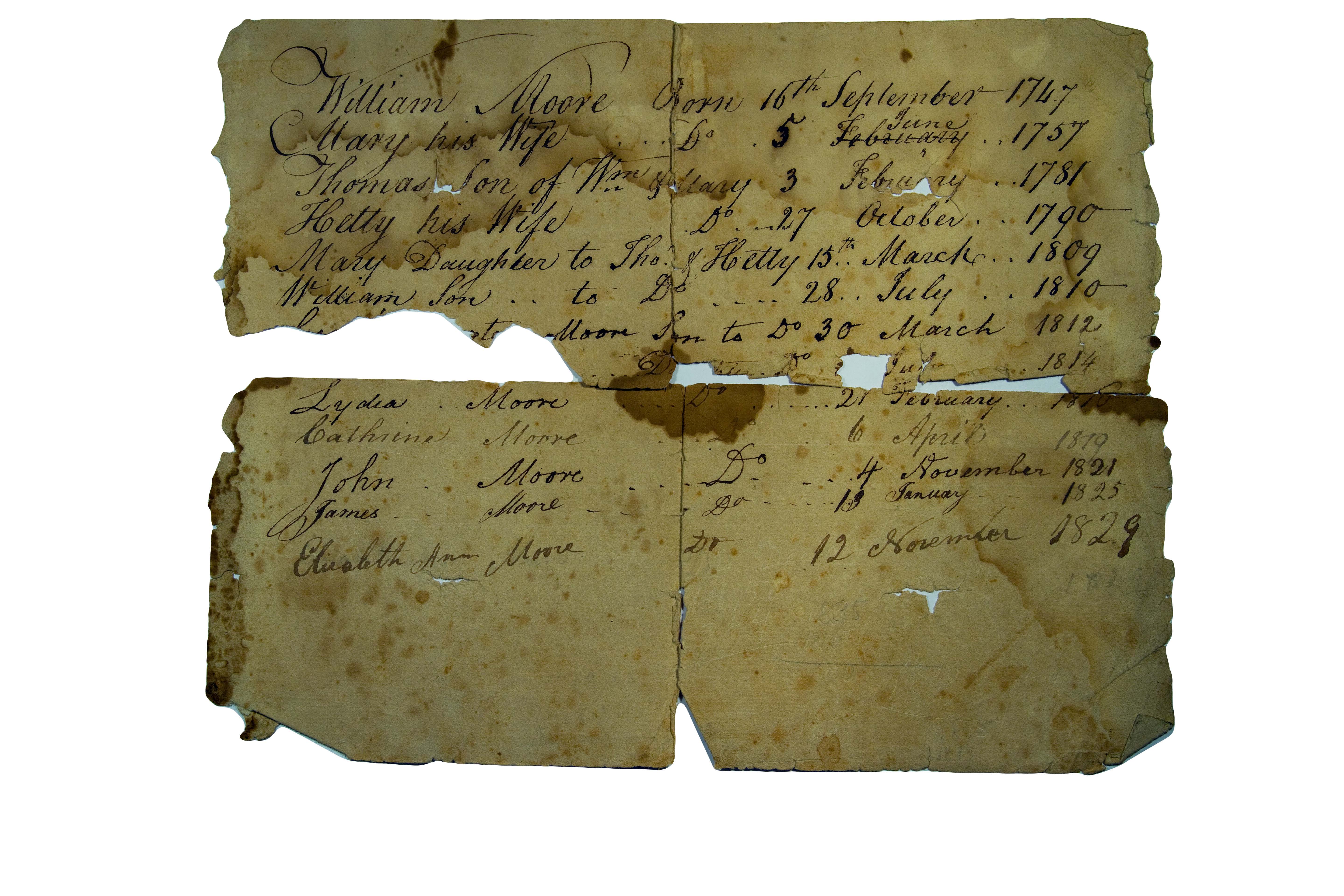 This old document is still in the family's possession. It is taken as authoritative, tying together three generations of this Moore line. Broken pieces can be filled in from other records. Be a handwriting expert - when was it written?